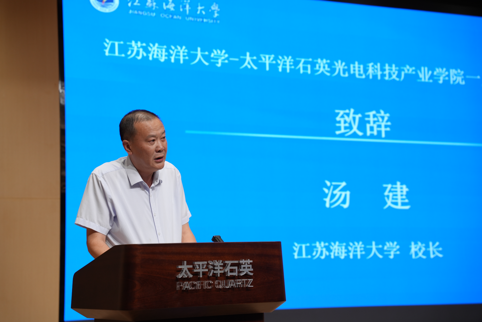 校长汤建在致辞中高度肯定了产业学院一年来的建设成效。他介绍,学校始终秉承“校企融通、需求导向”的核心理念,将太平洋石英光电科技产业学院作为学校重点建设的产业学院予以优先保障和全力推进,产业学院的蓬勃发展,是必发集团7790全力推进“三建一高”暨推进向海转型建设、一流应用型本科高校建设、博士学位授予单位建设的有力支撑,将聚焦四大核心任务协调发力:一是三年内建成“石英光电材料与器件实验室”,并联合申报江苏省重点研发计划;二是对接学校“一流应用型本科高校建设”目标,持续优化人才培养体系;三是聚焦拉曼光谱仪器应用,着力突破高纯度石英检测关键技术壁垒;四是积极服务区域发展,共同打造海洋科技创新高地。